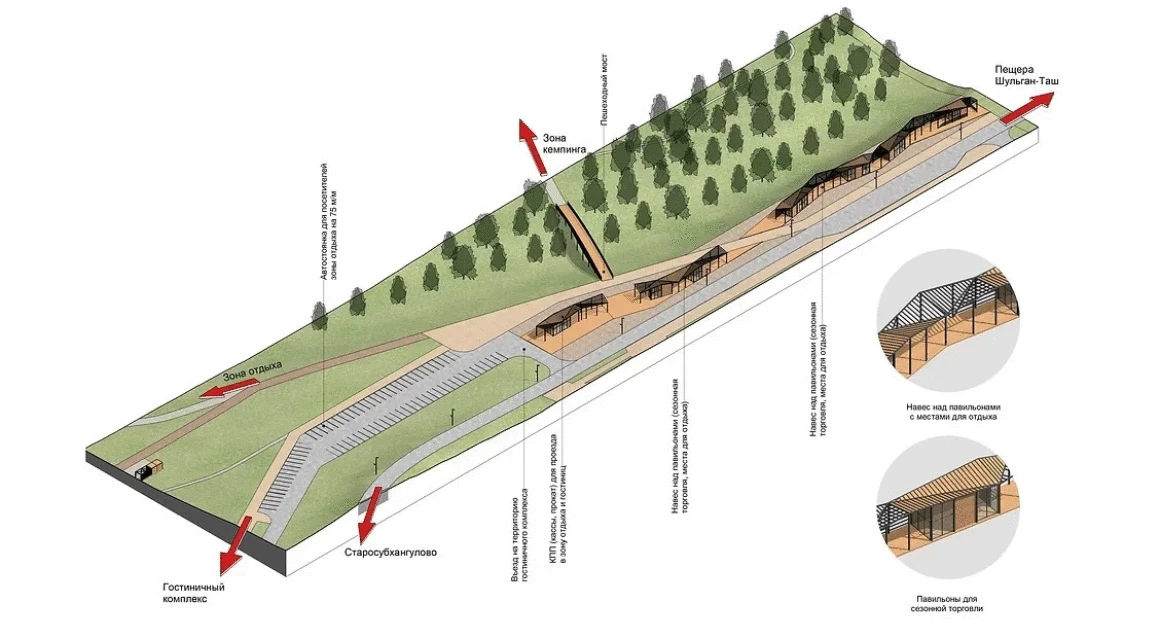 Комплексное развитие территории прилегающей к ИКМЗ «Пещера Шульган-Таш» - одна из острых задач развития региона. Сейчас его инфраструктура не развита, территория не благоустроена и не реализует рекреационный потенциал в полной мере. Одна из основных задач проекта – развить потенциал территории и подчеркнуть уникальное расположение сохранив бережное отношение к природе. Концепция развития территории охватывает различные сценарии использования как культурно-просветительский, так и рекреационный, решает вопросы обеспечения жильем и автостоянками для туристов. Задача сделать территорию функционально насыщенной, открытой для всех групп жителей, использовав и раскрыв ее потенциал.