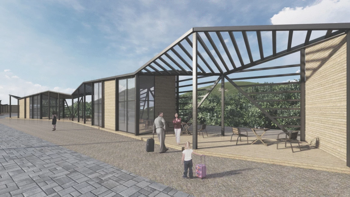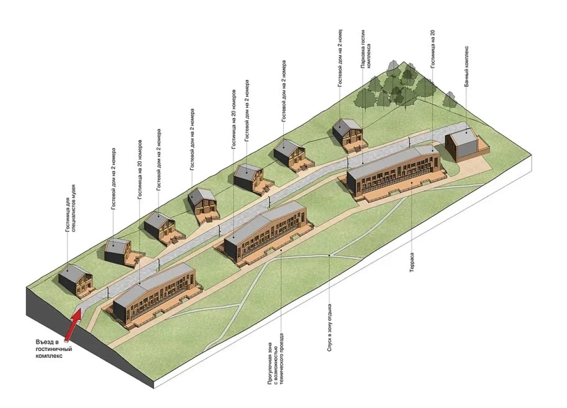 Зона гостиничного комплекса состоит из двух типов гостиниц: гостиницы на 20 номеров с террасами с видом на реку, на первом этаже которых предусмотрены общественные функции, а также гостевые дома на 2 номера и банный комплекс.