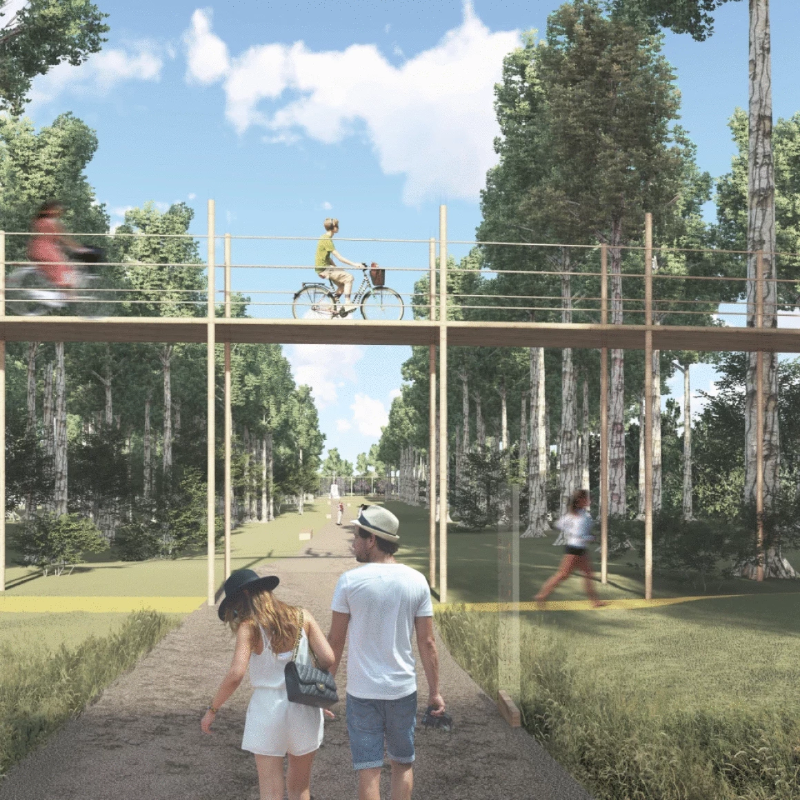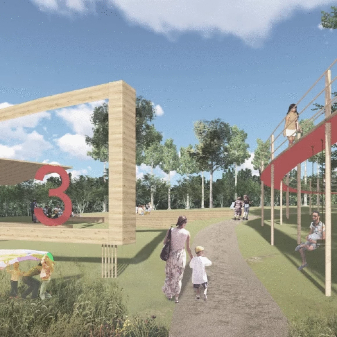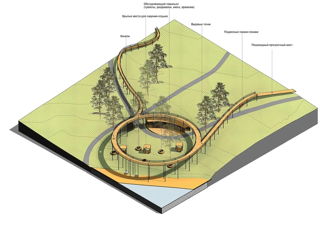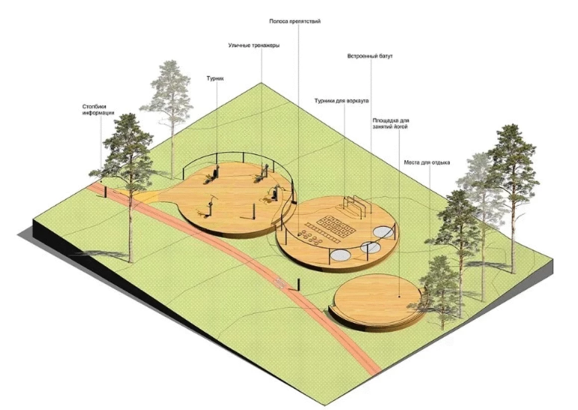 Проектным предложением предусмотрено 3 маршрута: прогулочно-просветительский, прогулочно-оздоровительный и веломаршрут. Прогулочно-просветительский маршрут включает в себя следующие площадки: зону отдыха у Памятника Красноармейцам, детскую зону,событийную зону для массовых мероприятий, событийную зону для камерных мероприятий, тихую зону и пляжную зону. Для более легкой навигации по парку данные зоны промаркированы цифрами. Прогулочно-оздоровительный маршрут включает спортивную зону и имеет несколько уровней протяженности. Веломаршрут также проходит через спортивную зону и мост для пешеходных и велопрогулок. Все маршруты сопровождаются стендами навигации, информации о парке и произрастающей на данной территории растительности, что способствует формированию знаний о природе и уважительном отношении к ней