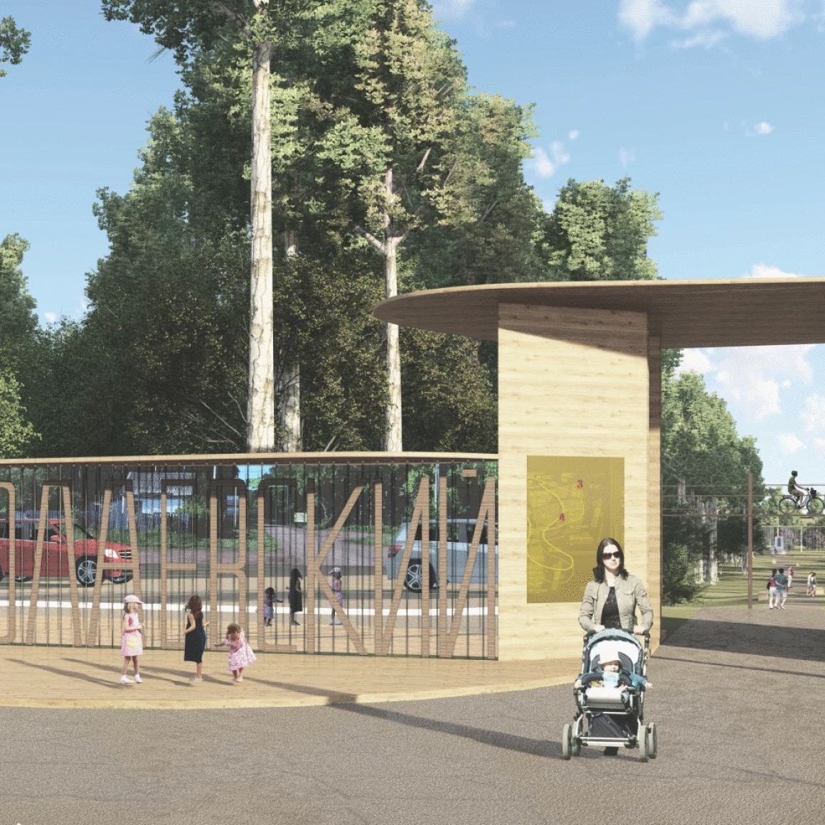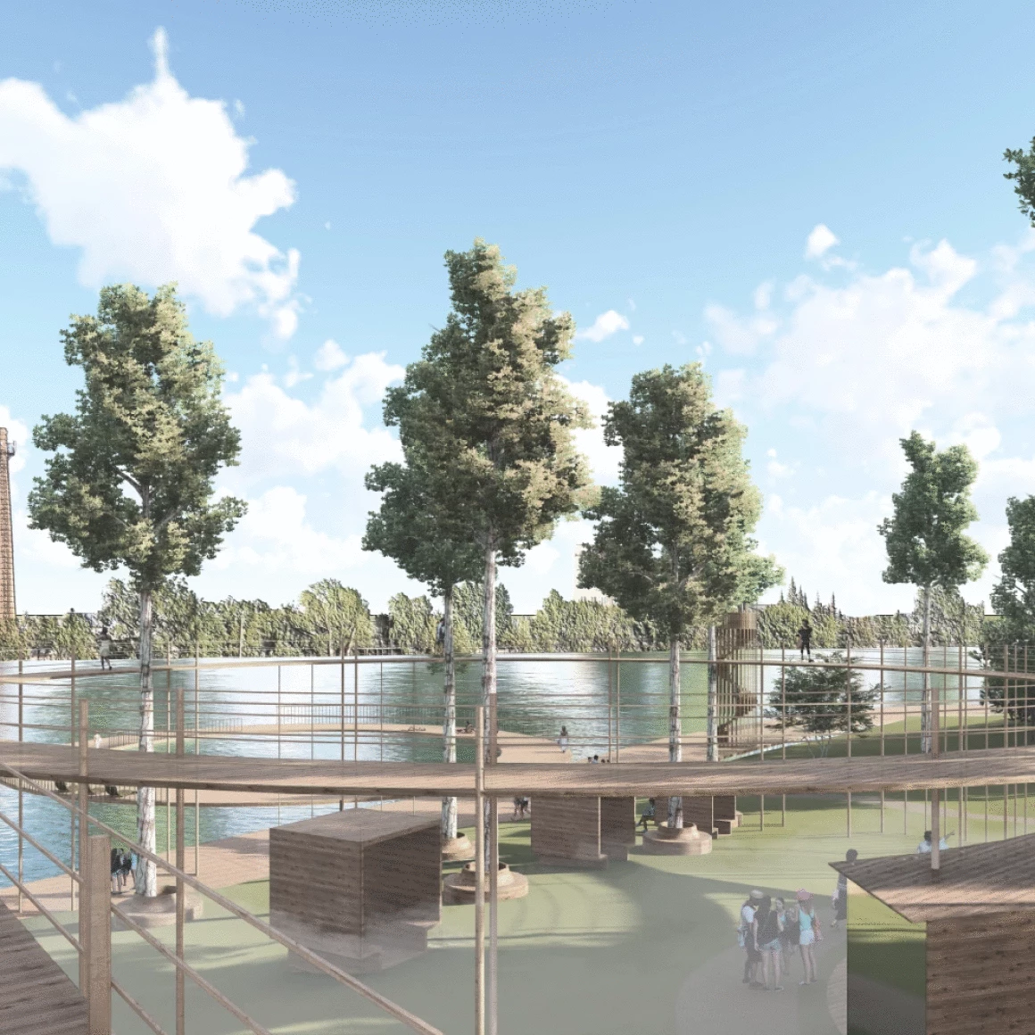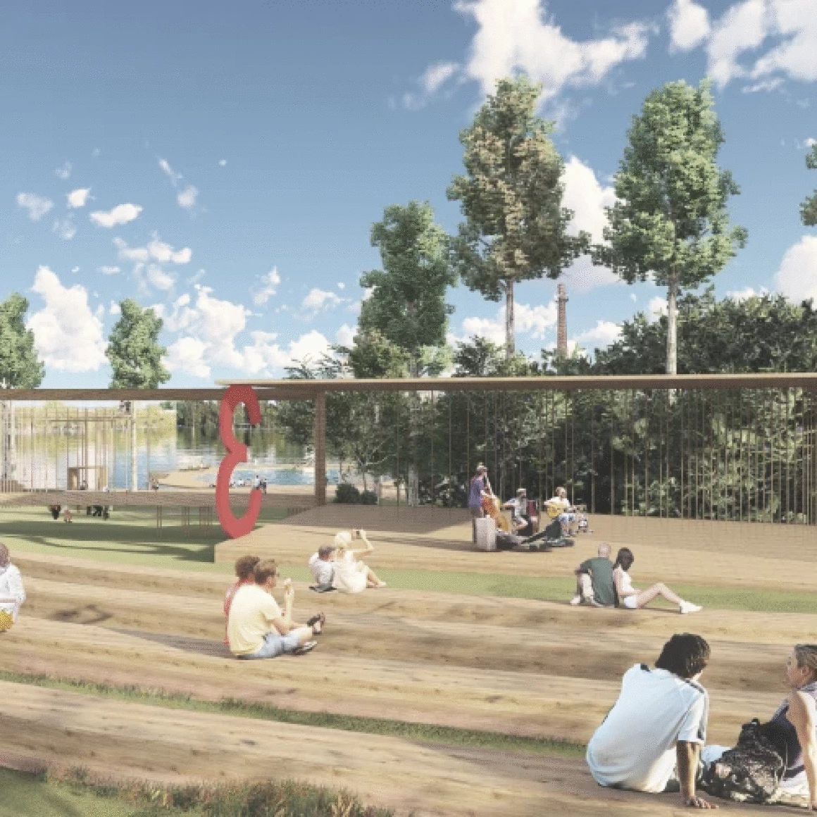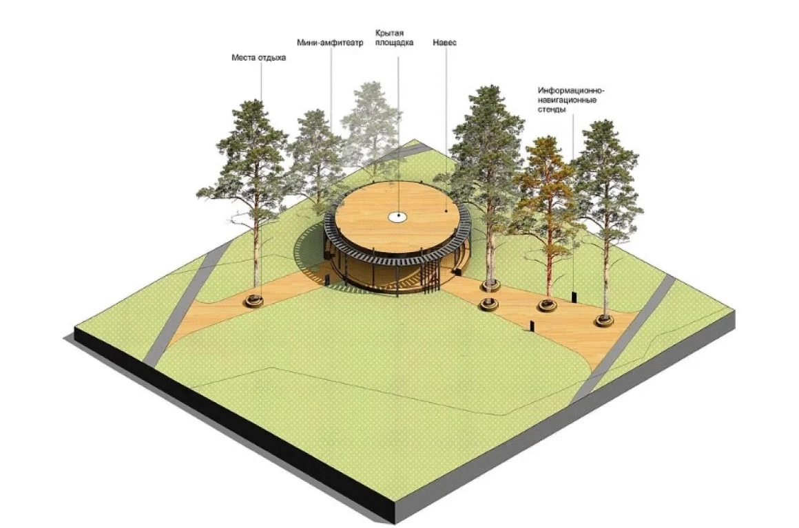 Событийная зона для массовых мероприятий состоит из амфитеатра на 200 посадочных мест, открытой площадки для проведения активных действий и крытой сцены с видовым окном, откуда открывается прекрасный вид на пруд и противоположный берег. Амфитеатр является местом притяжения, объединяющий людей любого возраста, именно здесь будут проходить шумные мероприятия и спокойные музыкальные вечера.