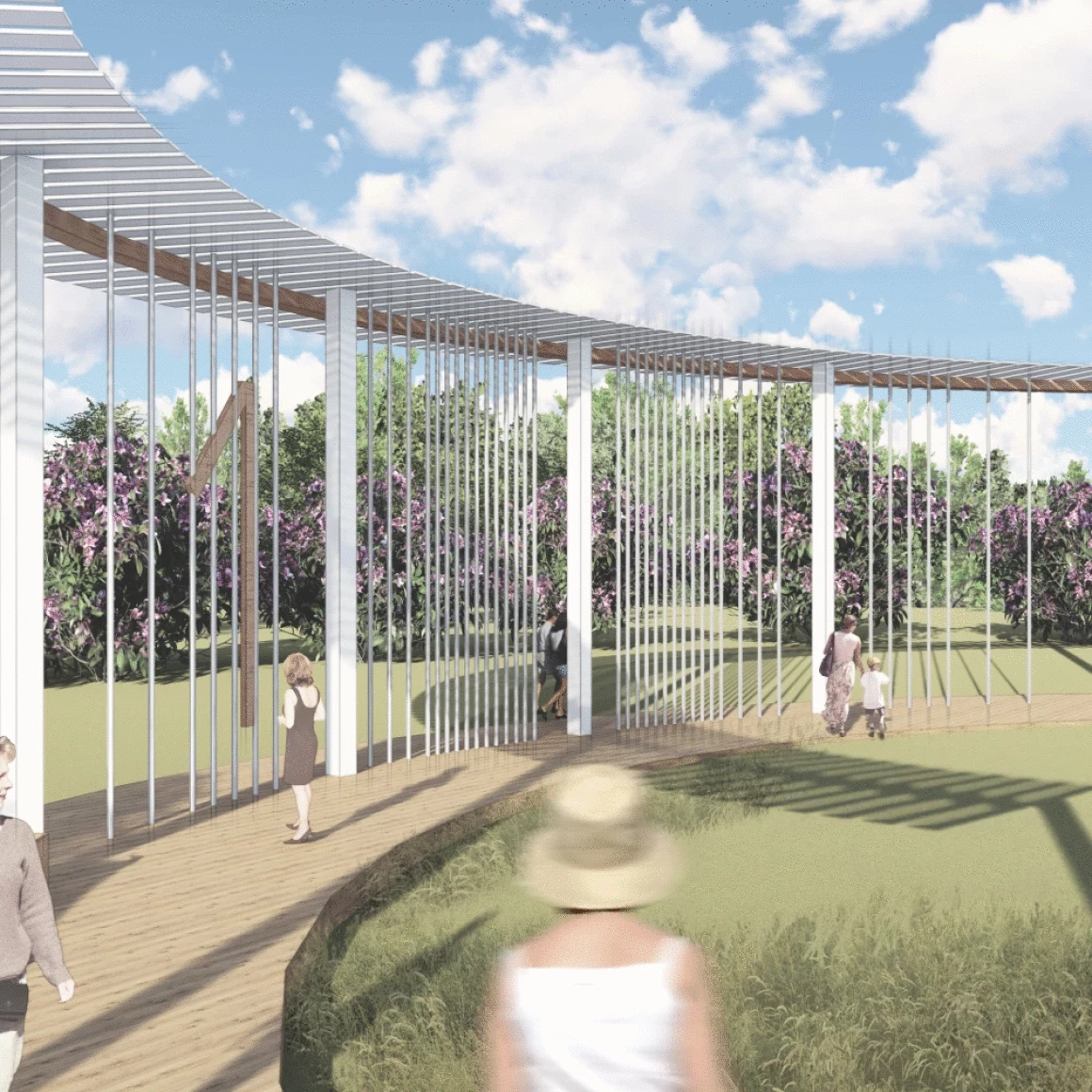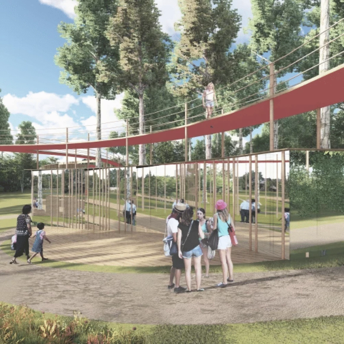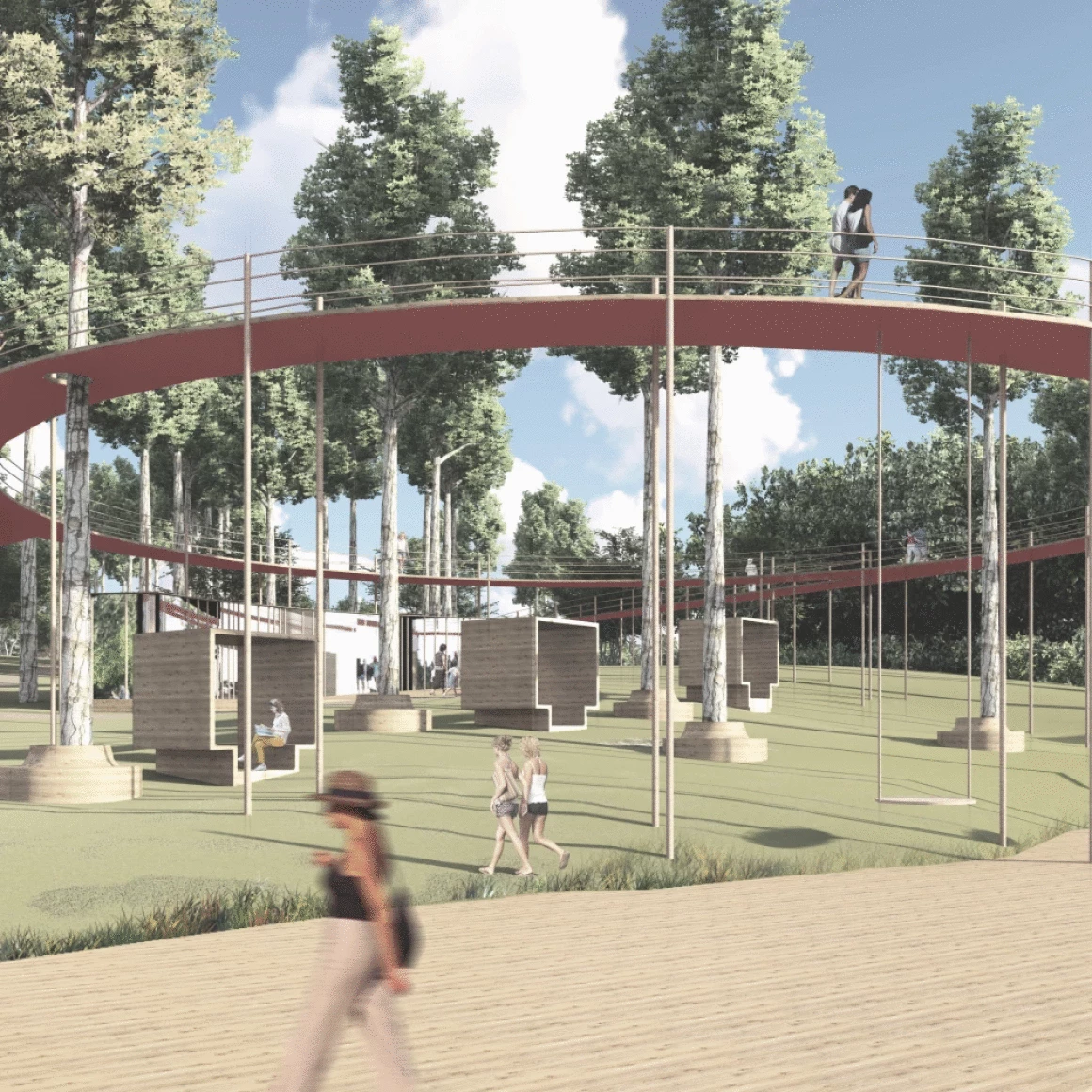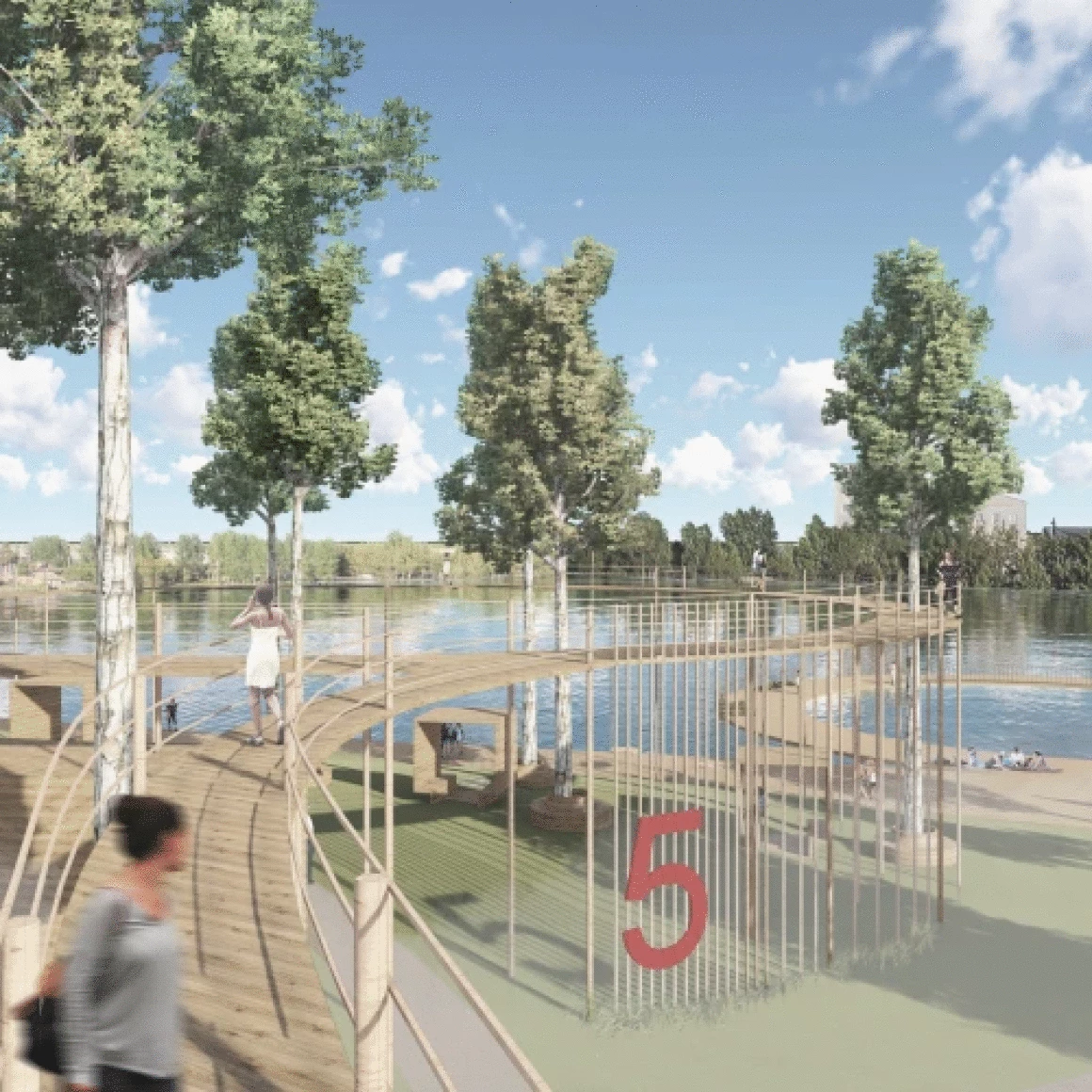 Событийная зона для массовых мероприятий состоит из амфитеатра на 200 посадочных мест, открытой площадки для проведения активных действий и крытой сцены с видовым окном, откуда открывается прекрасный вид на пруд и противоположный берег. Амфитеатр является местом притяжения, объединяющий людей любого возраста, именно здесь будут проходить шумные мероприятия и спокойные музыкальные вечера.