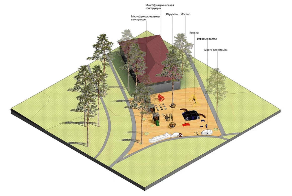 Детская зона отделена игровыми холмами, которые одновременно являются ограничителем территории и игровым элементом. Оборудование площадки многофункционально, что позволяет детям находить разные пути применения одного и того же элемента.