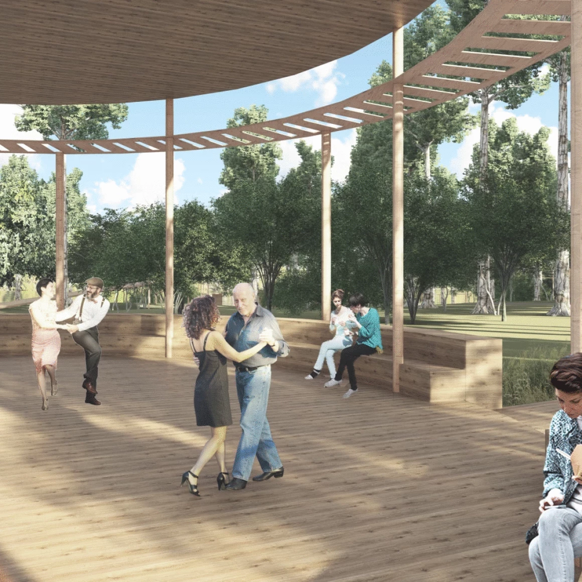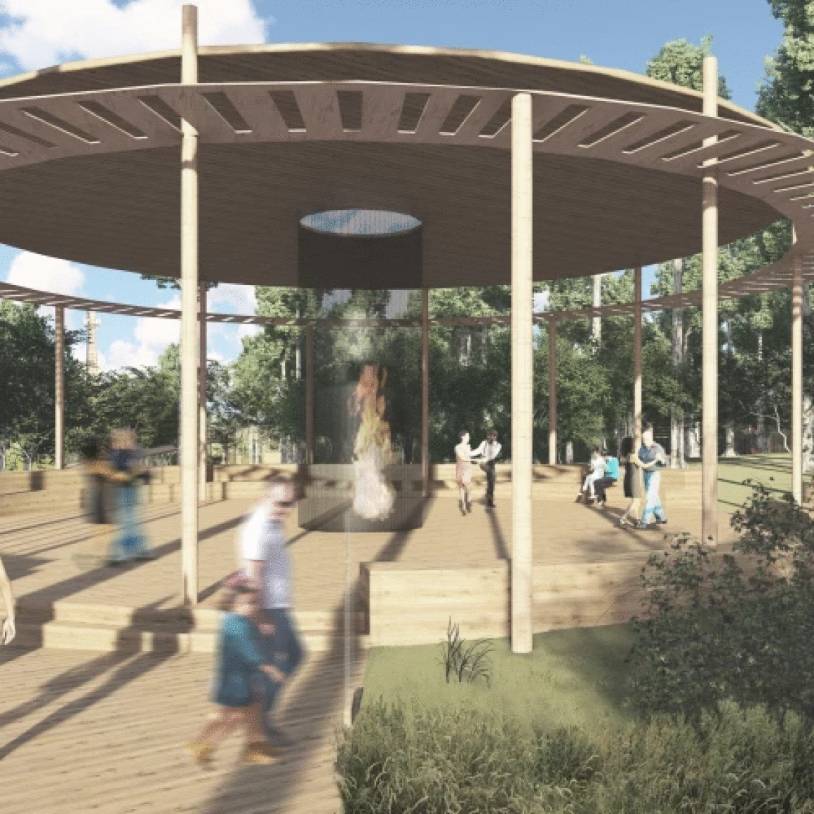 Событийная зона для камерных мероприятий представлена крытой беседкой с центральным очагом, находящейся среди густой зелени, что делает её более приватной и тихой. Здесь предполагается проведение небольших мероприятий, лекций и танцевальных вечеров, возвращающих площадке её первоначальную функцию (танцевальная площадка) и наполняющие её жизнью