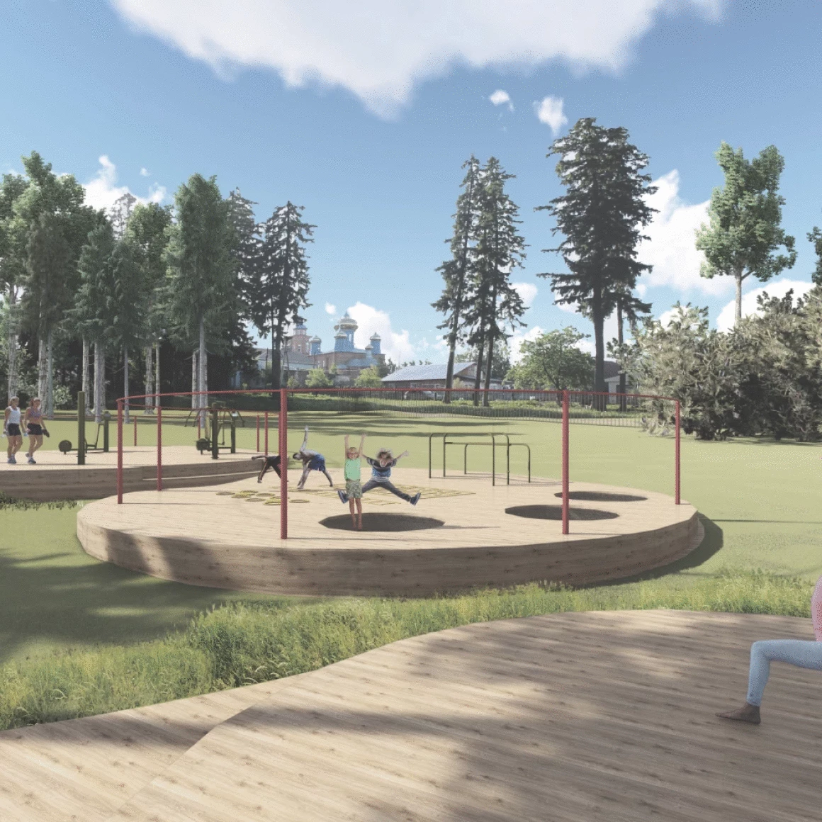 Спортивная зона представлена уличными тренажерами, встроенными батутами, полосами препятствий, турниками и площадкой, на которой можно заняться утренней зарядкой, йогой. Так же в спортивной зоне находятся места для отдыха с видом на Свято-Тихоновский храм.