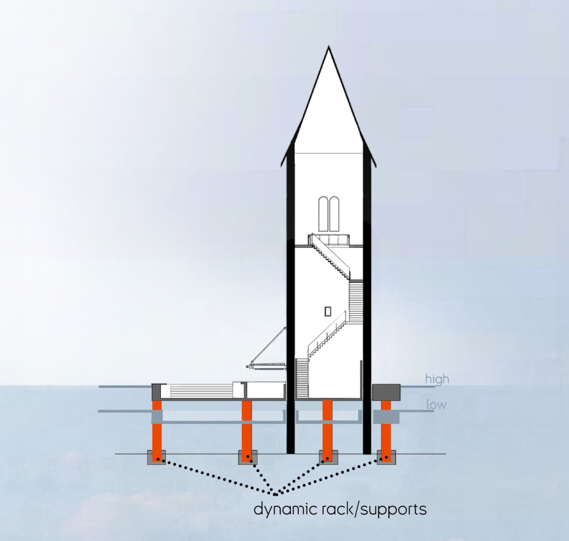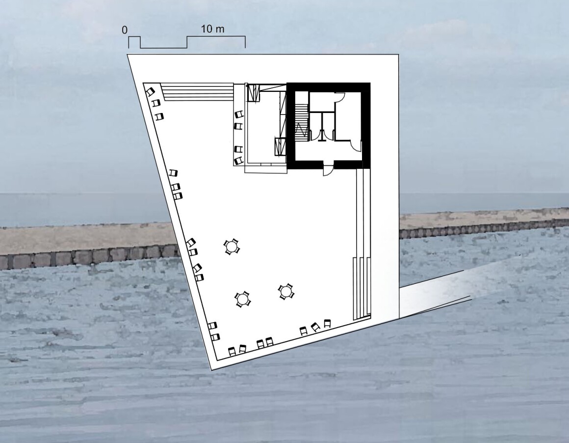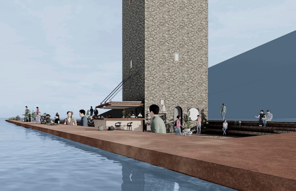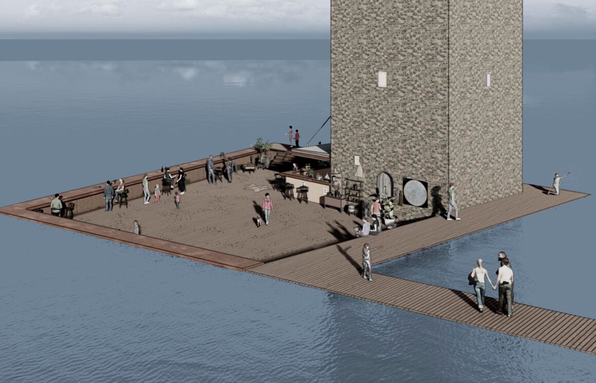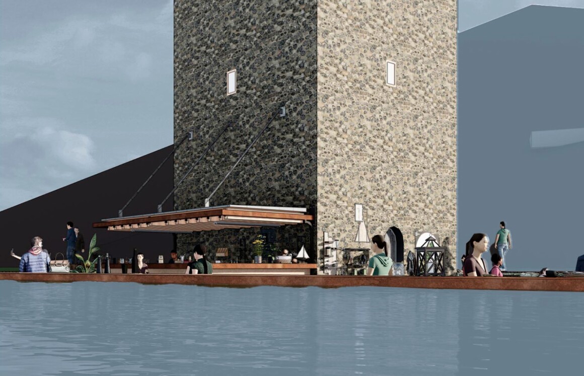 Ресторан расположен ниже уровня воды, что делает его практически незаметным издалека и не отвлекает от исторической башни.