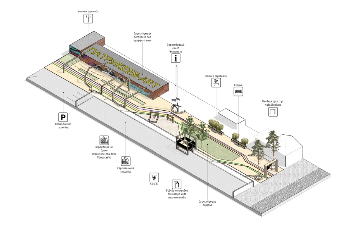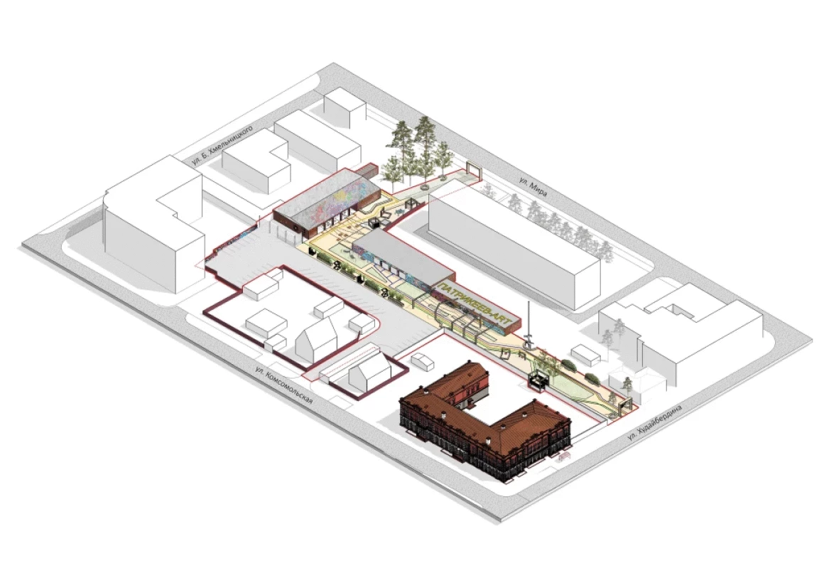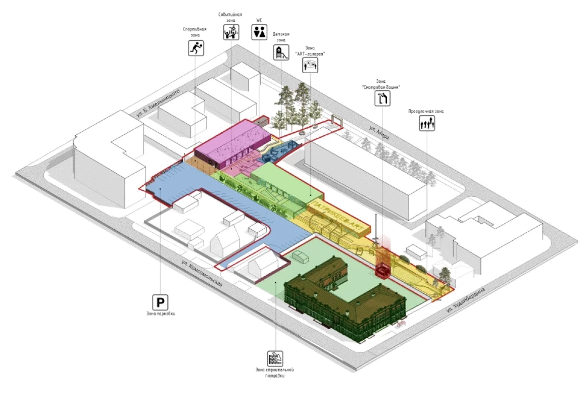 Предусмотрено развитие внутреннего пространства квартала с раскрытием и усилением связи со сквером, созданием пешеходного променада, насыщенного различными функциями. Интересным решением является смотровая, башня с которой можно будет наблюдать за ведением работ по реставрации объекта культурного наследия "Дом ПАТРИКЕЕВА"