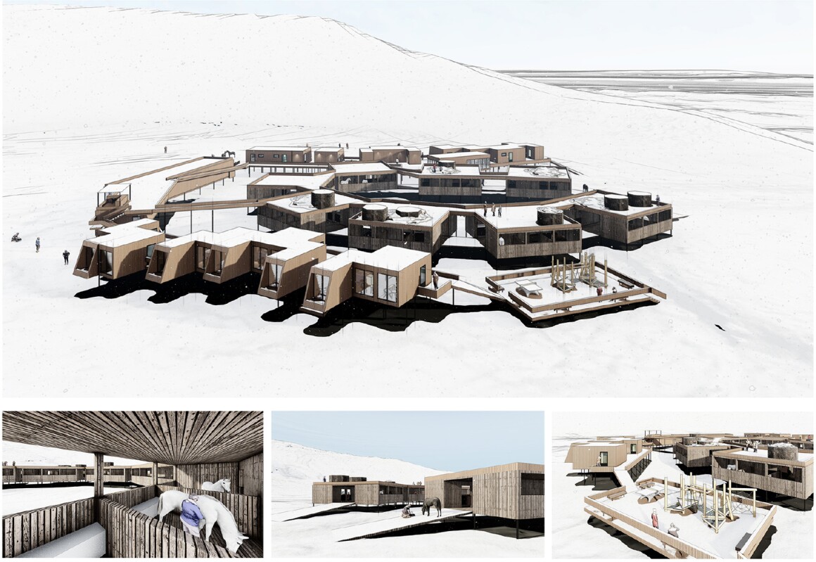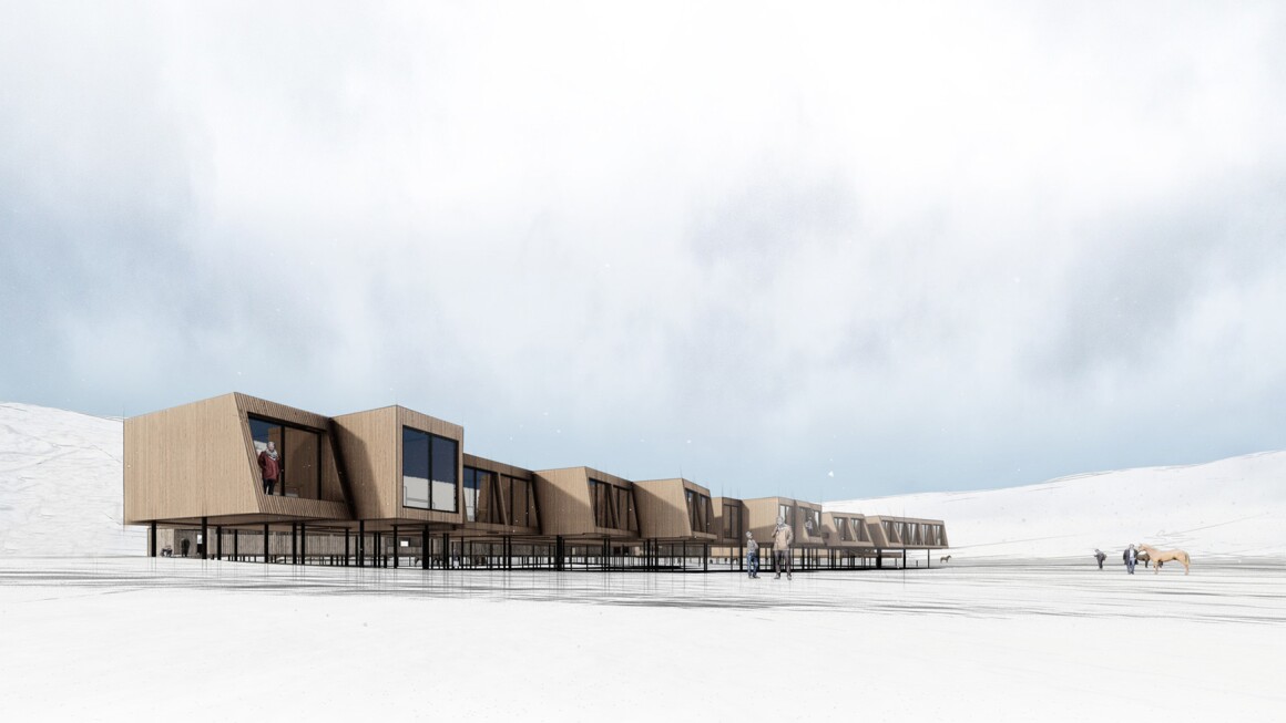 Модульная структура позволяет впоследствии легко модифицировать или адаптировать пространство без значительных затрат. Это будет полезно в условиях меняющихся потребностей пользователей. Отели, построенные в виде блоков, позволяют сохранить масштаб отеля и создают ощущение объемности застройки. блоки включают одноместные, двухместные и семейные номера. С крыши ресторана открывается захватывающий вид на кратер. Крыша будет использоваться в качестве смотровой площадки. Конюшни станут не только местом для содержания лошадей, но и функциональным элементом. Крыша будет эксплуатируемой, обеспечивая дополнительное пространство для хранения сена и специальных резервуаров для питьевой воды.